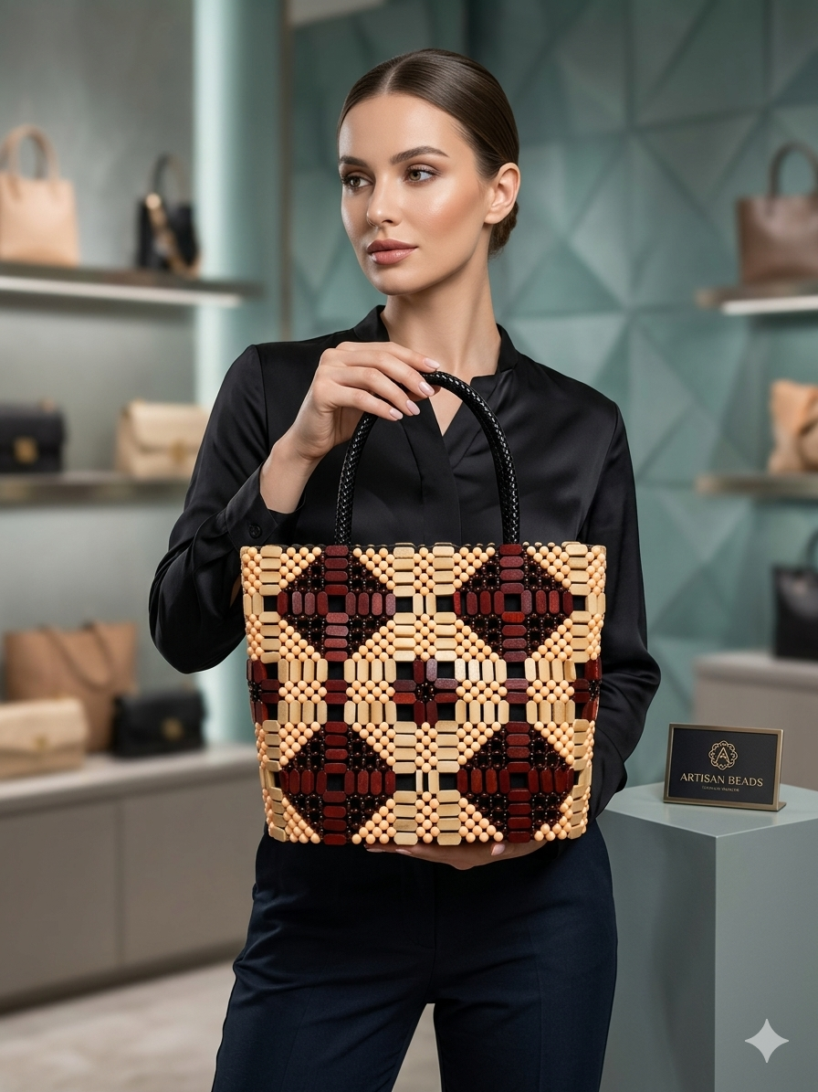 This exquisite tote bag is a masterclass in texture and geometric artistry. Carefully constructed with high-quality, polished wooden and resin beads, it features a striking diamond-patterned mosaic that blends traditional craftsmanship with a contemporary boutique aesthetic.