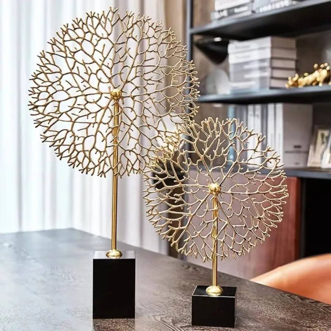 - Minimalist Pedestal: Each fan is elevated by a slim, polished gold stem. This vertical element provides a clean transition from the organic fan to the geometric base, giving the sculpture an airy, floating appearance.