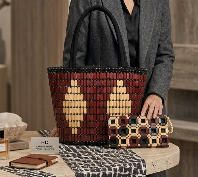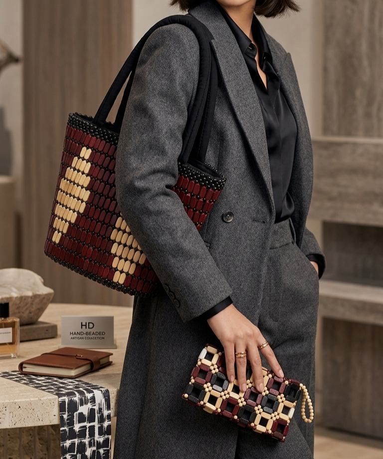 The Clutch: A perfectly coordinated handheld accessory that mirrors the intricate beadwork of the tote. Ideal for transitioning from a day of boutique shopping to an elegant evening event.