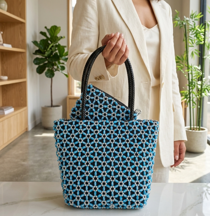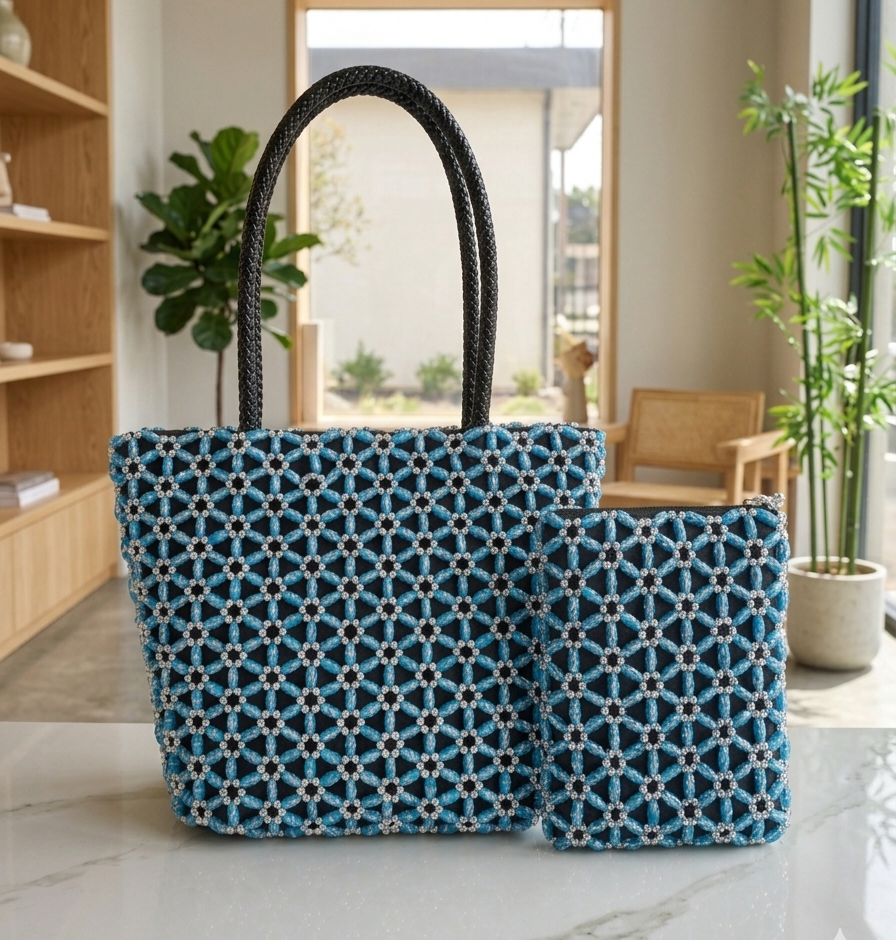Two-piece set handcrafted beaded tote bag and a matching zippered pouch 380.00